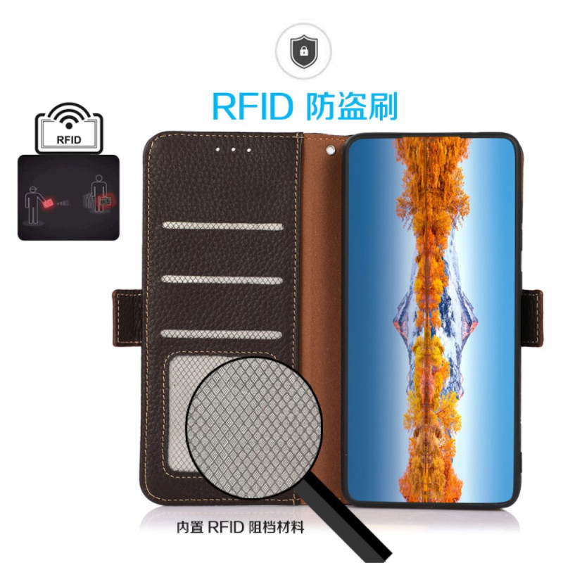 Upptäck vårt fodral i äkta läder för Xiaomi Redmi Note 14 5G. Snyggt och praktiskt med RFID-skydd, fack för kort och anteckningar och kan omvandlas till ett stativ.