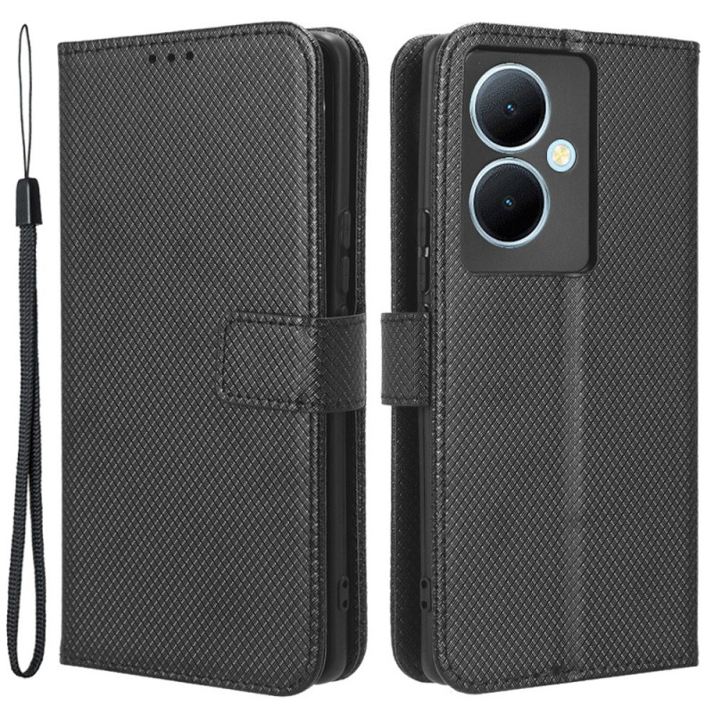 Stylish wallet case with sophisticated diamond texture for your Vivo V29 Lite 5G. Features card slots, a cash pocket and an integrated foldable stand for hands-free viewing.