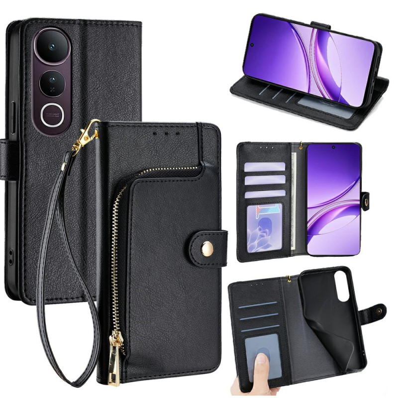 Multifunction wallet case for Vivo V50 Lite 5G with elegant oil wax texture. Features card slots, external zip pocket, foldable stand and secure magnetic closure. Complete protection against bumps and drops.