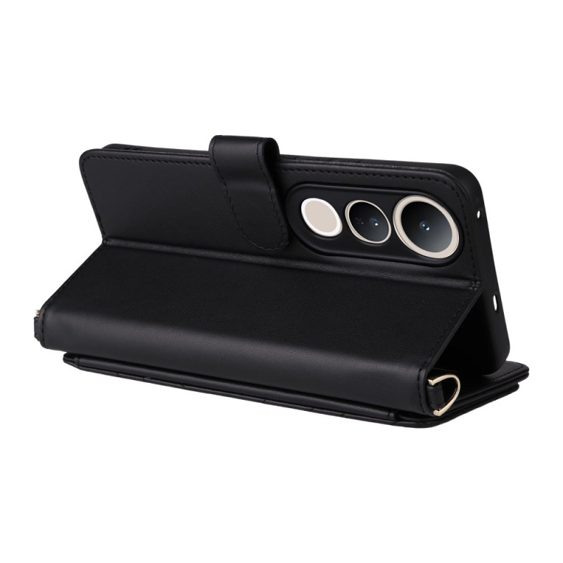 Stylish wallet case for Vivo V50 Lite offering full protection. Features 6 card slots, adjustable stand and secure magnetic closure. Comes with adjustable shoulder strap and removable hand strap for easy carrying.