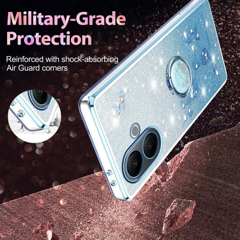 Protect your Vivo V60 Lite in style with this sparkling case adorned with eternal flowers and rhinestones. Its integrated rotating ring allows hands-free viewing and a better grip for optimal everyday use.
