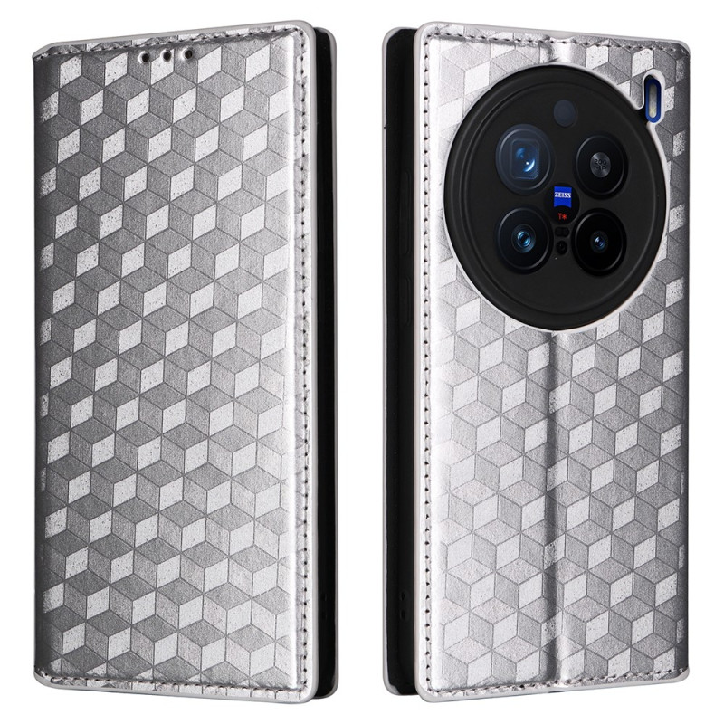 Elegant wallet case in PU leather with 3D diamond pattern for Vivo X200 Pro 5G. Features 2 card slots, adjustable viewing stand and secure magnetic closure. Full 360° protection against bumps and scratches.