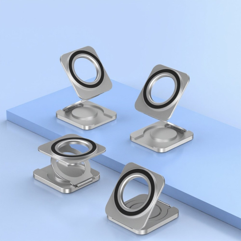 The double-sided magnetic phone holder offers a smooth, elegant user experience thanks to its aeronautical aluminium alloy and non-slip silicone design. Its double-sided magnetic system allows 360° rotation and multi-angle adjustment, ideal for portrait or landscape mode. Ultra-thin (just 10 mm when folded), it slips easily into a pocket or bag. Stable, lightweight and compatible with all MagSafe models, it's equally suited to smartphones and tablets for office use, streaming, video calls or use in the car.