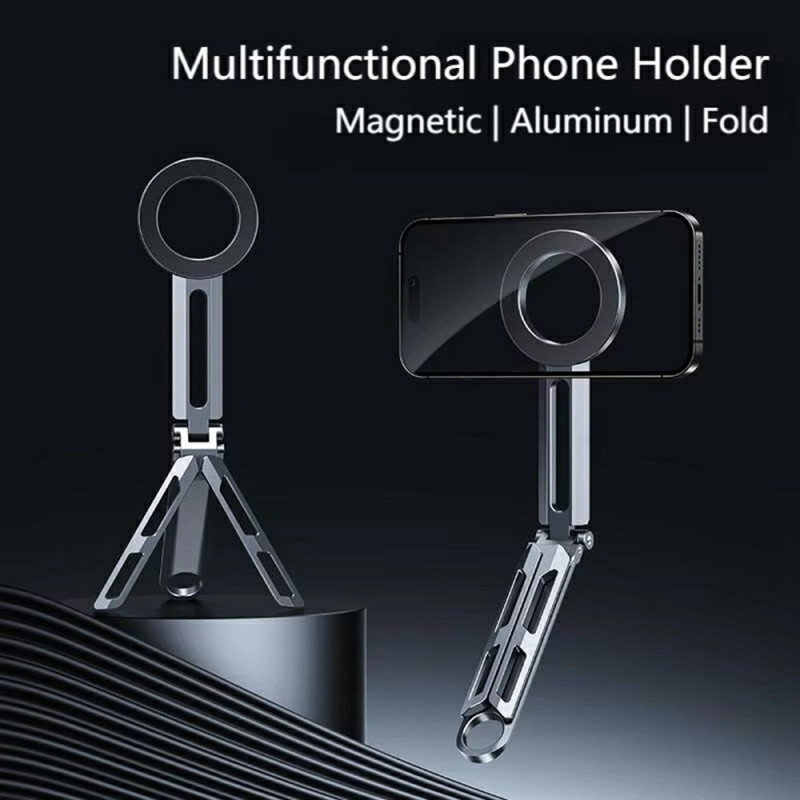 The foldable magnetic phone holder with tripod offers a versatile solution for filming, working or watching content in total freedom. Its ultra-powerful N52 magnet ensures a stable hold, even on the move. Thanks to its 360° rotation, it's easy to find the perfect angle for your videos or calls. Compact and foldable to 50% of the size of a phone, it slips easily into a pocket or bag. Made from lightweight, hard-wearing aluminium alloy, it can be fixed to a table, an air vent (via clip) or used with its integrated tripod for solid support in all circumstances.