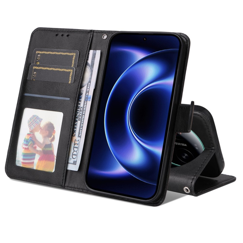 Stylish textured PU leather wallet case for Xiaomi 17 Ultra 5G. Multifunctional design with integrated card holder, hands-free viewing stand and secure magnetic closure. Full 360° protection with durable TPU shell.