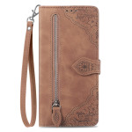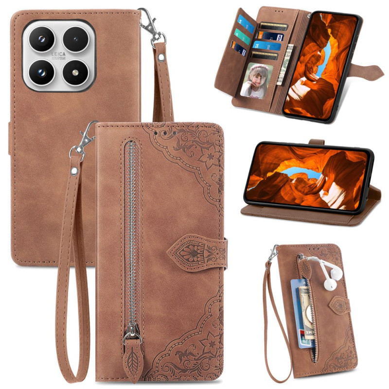 Elegant wallet case in PU leather with refined floral motif. Multifunctional design with card compartments, external zip pocket, integrated viewing stand and practical hand strap. Complete protection against scratches and drops.