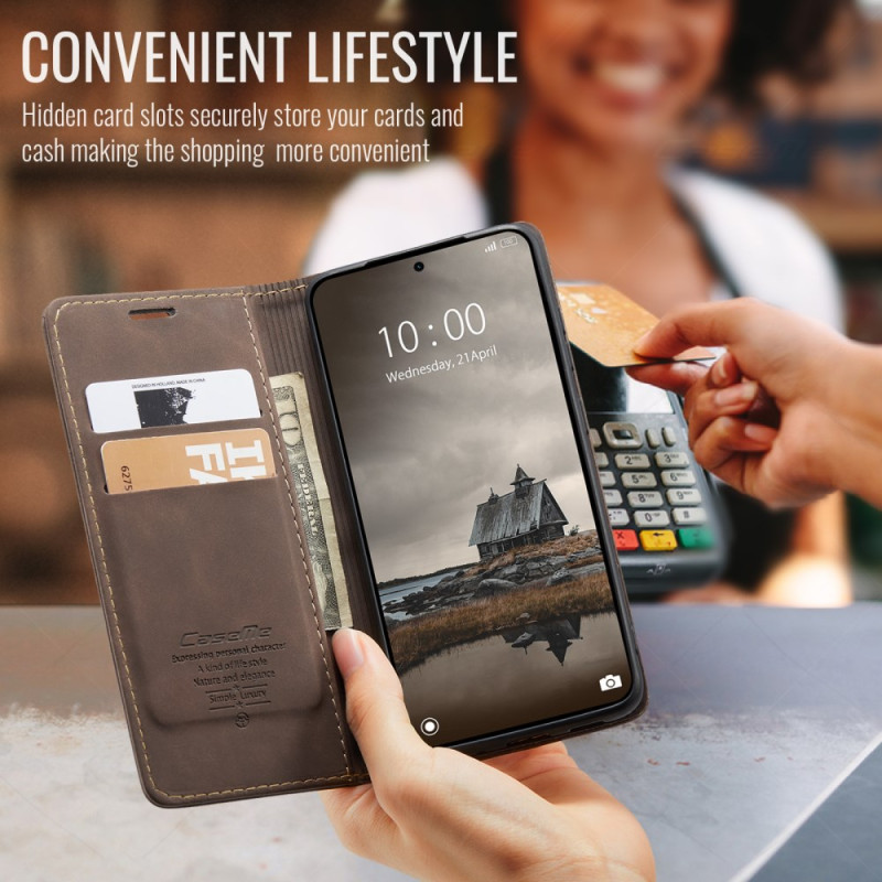 Discover the CASEME 013 wallet case for Xiaomi Redmi Note 15 Pro 4G. Elegant retro design with compartments for cards and money, adjustable viewing stand and secure magnetic closure. Complete protection for your phone.